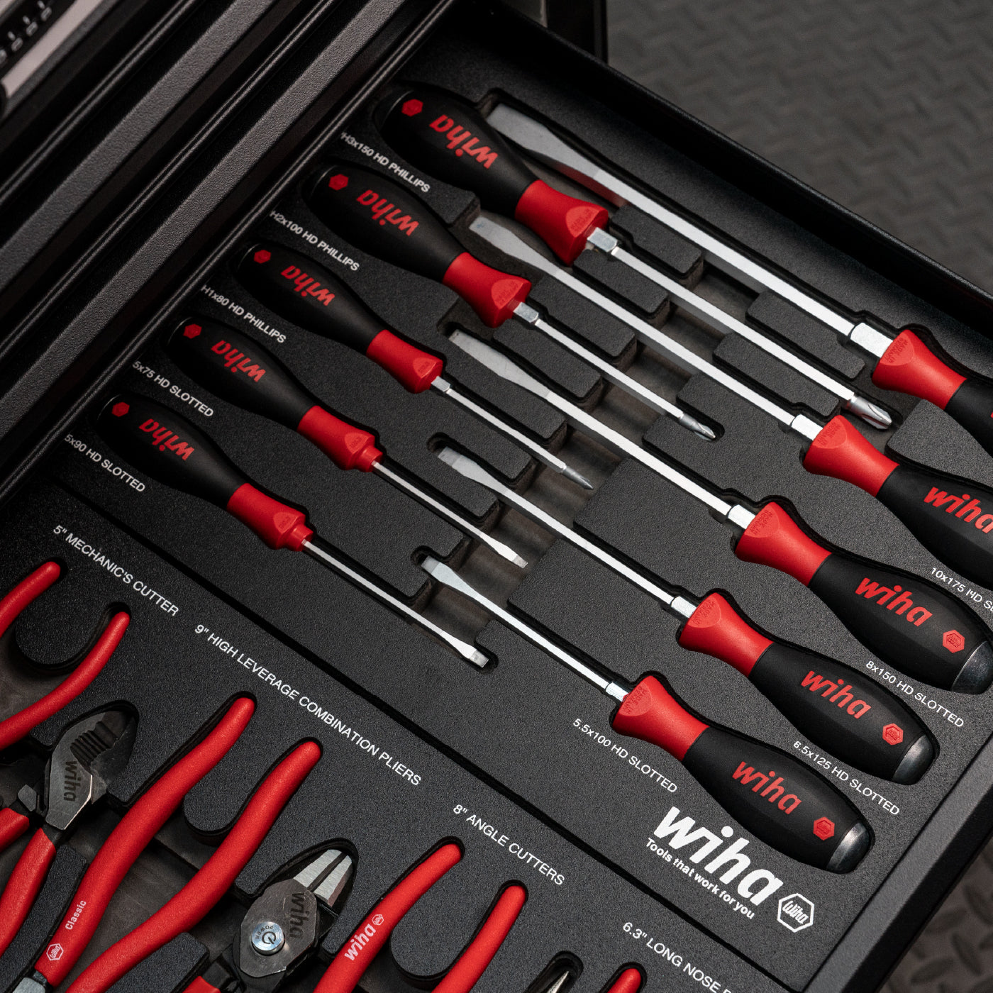 Incorporating the best of both functionality and organization, Wiha's selection of tool kits not only equip you with an extensive array of must-have tools but also provide exceptional storage solutions.