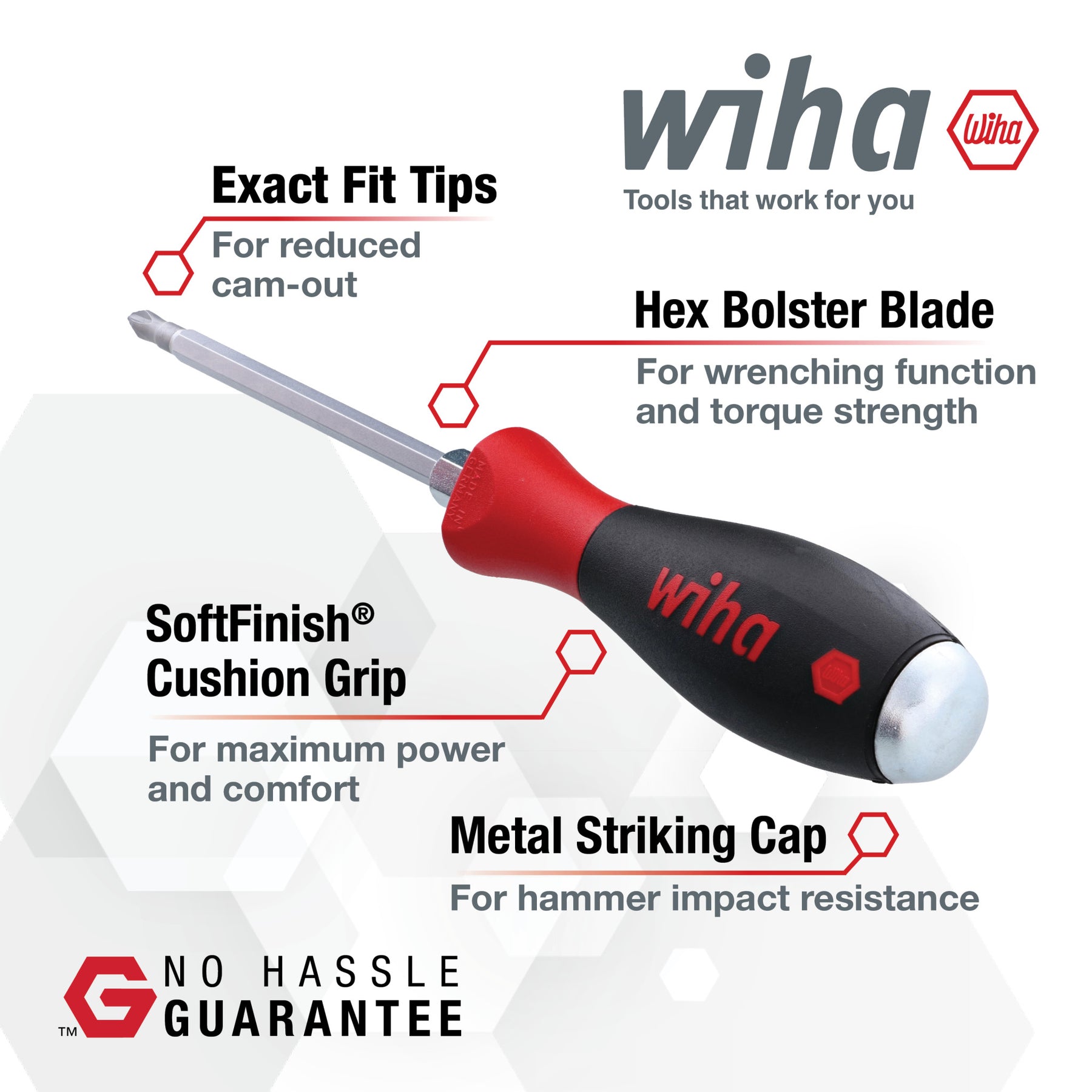Wiha SoftFinish Drivers are the standard for premium quality professional drivers. Wiha SoftFinish Drivers feature ergonomic cushion grip handles for comfort and control, dual durometer construction for long-lasting durability, and handles that are directly molded to the blade for a permanent bond. SoftFinish Driver handles are sized proportionately to the blade for consistent mechanical advantage. Wiha SoftFinish Drivers include parallel flats to prevent table-top roll-off, and driver tip profiles labeled on the cap for easy identification. Extra Heavy Design features a metal striking cap for hammer impact resistance and hex-bolstered blades for wrenching function and torque strength. Wiha SoftFinish Drivers consist of Wiha premium quality tool steel engineered for strength and durability, have a satin finish for corrosion protection, and feature exact fit precision machined tips to reduce cam out of fastener heads. You can buy with confidence knowing that this product is Backed by the No Hassle Guarantee.
