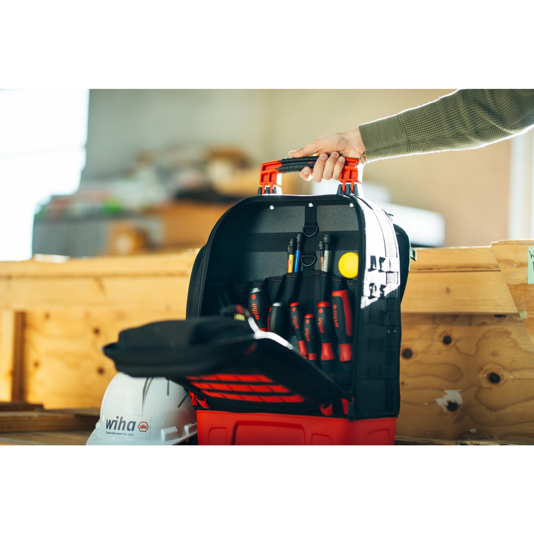 The Wiha 15-Piece Industrial Tool Set with Backpack is the ultimate solution for professionals needing a reliable, organized, portable tool kit. This comprehensive set includes a heavy-duty tool hauler backpack designed for durability and ease of transport, ensuring you can take your tools wherever the job demands. Inside, you'll find a selection of high-quality tools, including SoftFinish screwdrivers for comfort and precision, color-coded nut setters for quick identification, a dead blow hammer for efficient, vibration-free striking, and a folding ruler for accurate measurements. Whether you're working in construction, automotive, or general maintenance, this tool set is engineered to handle tough tasks with ease.