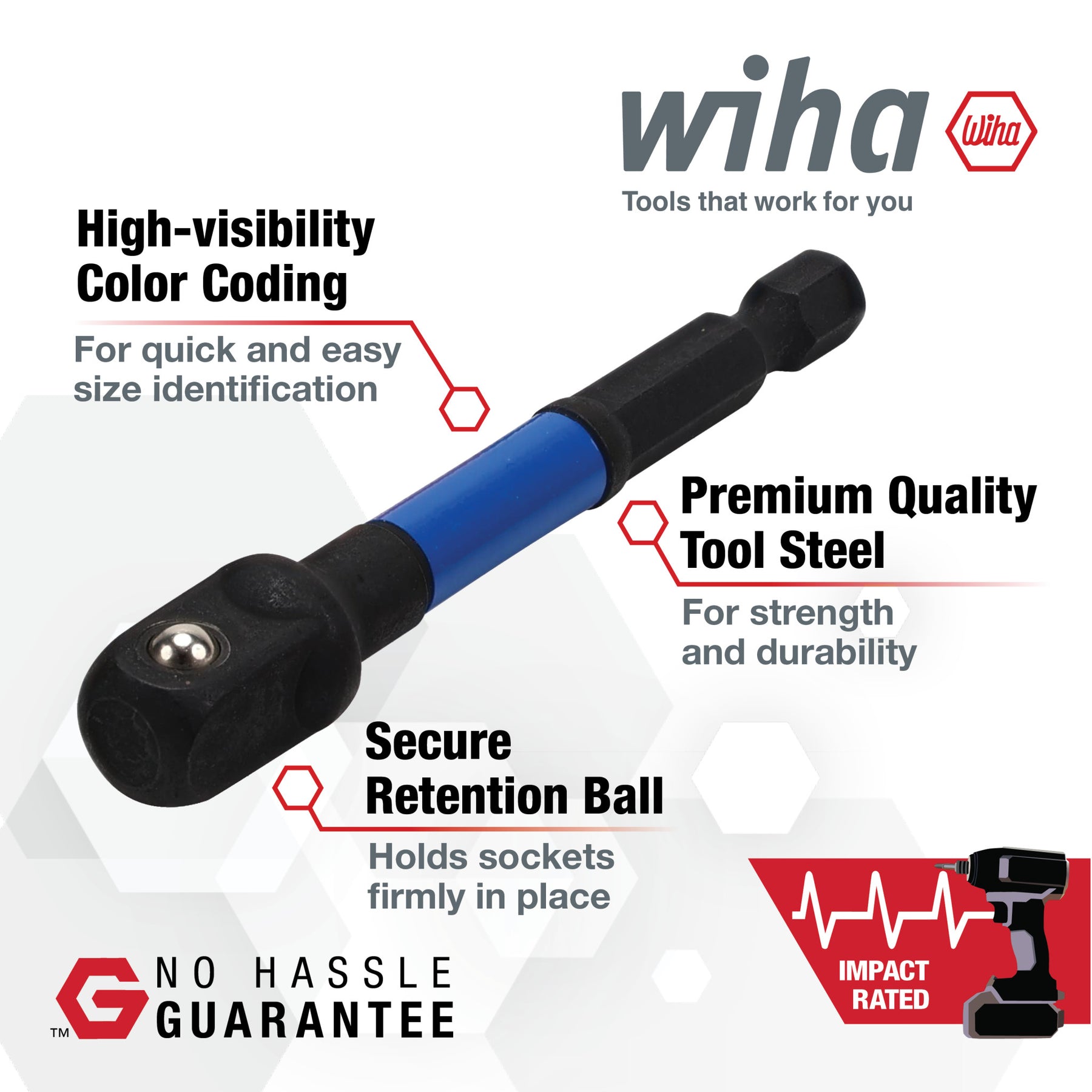 Introducing the Wiha Color Coded Socket Adapters. Designed for precision and convenience, these durable adapters allow for effortless transitions between various socket sizes. Each adapter is color-coded for easy identification, ensuring you can quickly find the right fit for your project. Crafted from high-quality materials, they provide a secure grip and are compatible with a wide range of fasteners.