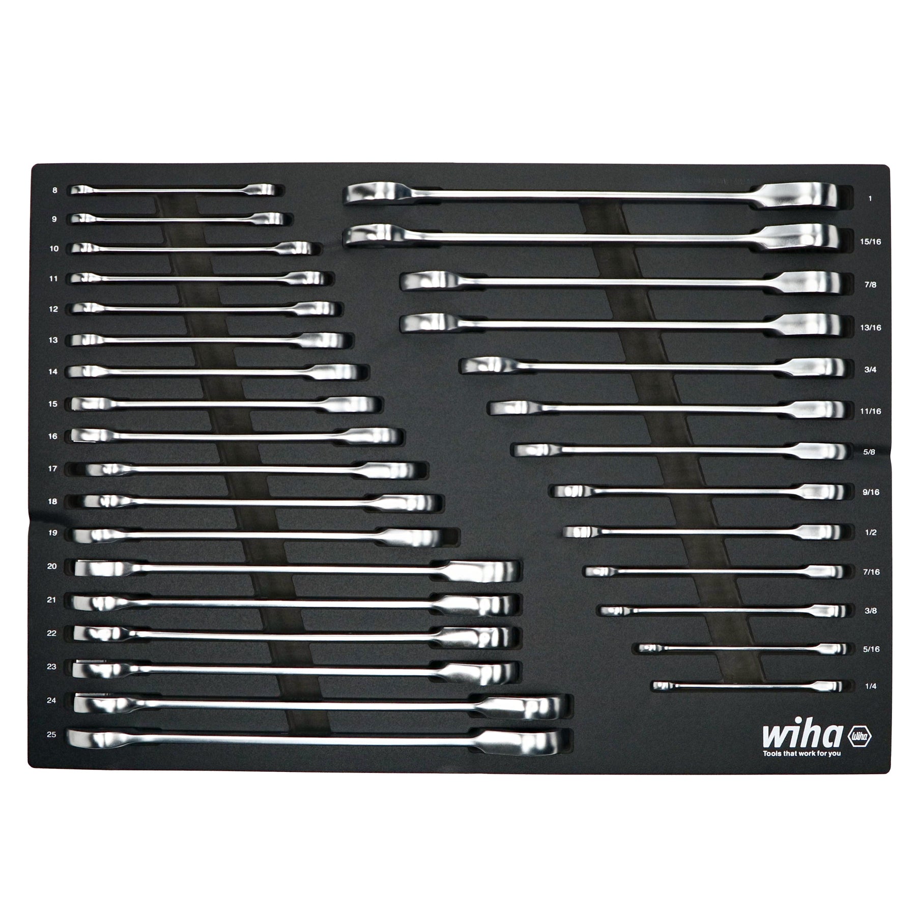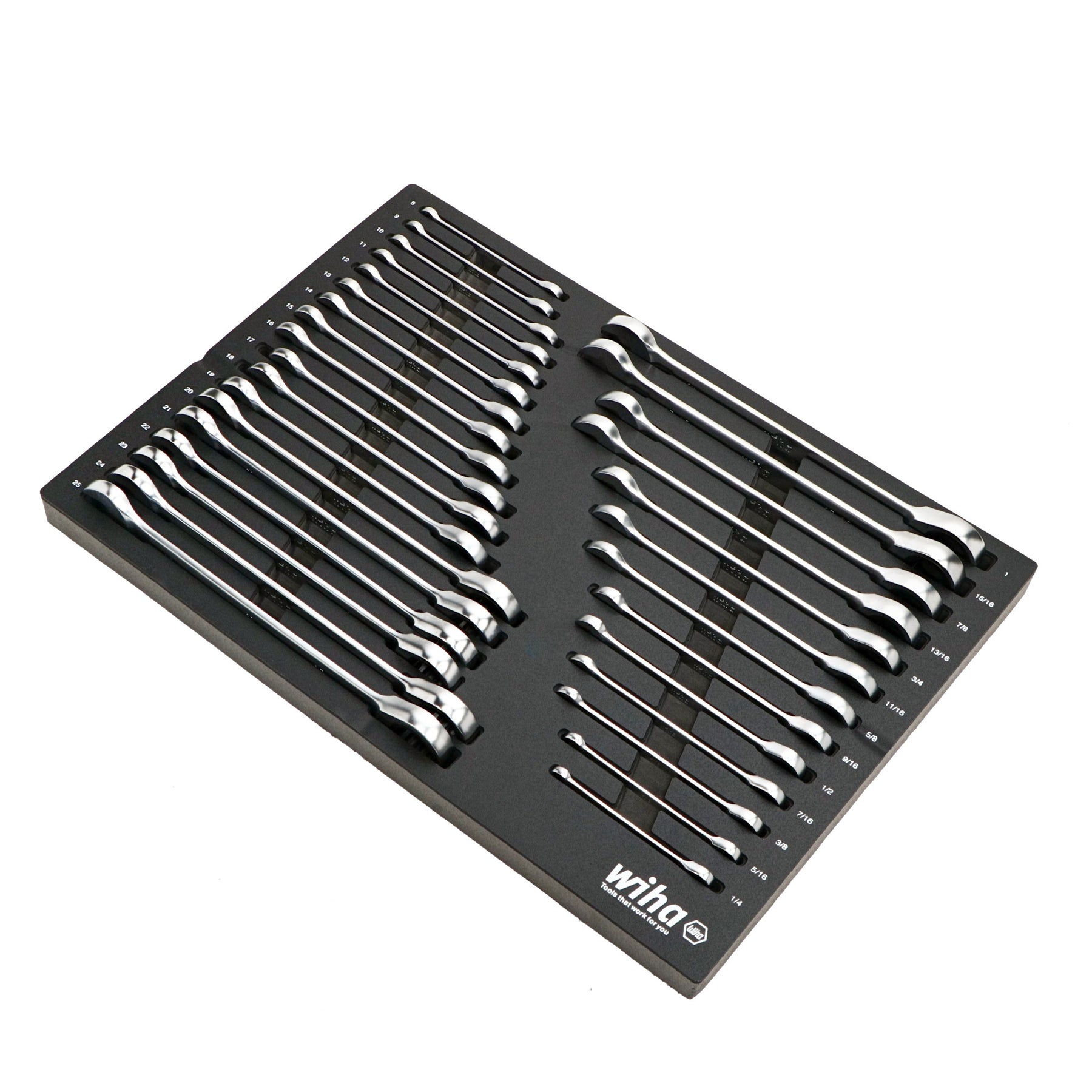 Wiha's Combination Wrenches have a 12-point box-end design with contact points that apply force to the flat sides of the fastener head—rather than the corners—to prevent the fastener head from rounding off. The open-end is angled 15 degrees for flipping the wrench between rotations to maximize rotations and the box-end offset 15 degrees for finger clearance and working around obstructions that limit access to the fastener. The wrenches consist of premium-quality tool steel, have a Chrome-plated satin finish for corrosion protection, and the size profiles are boldly stamped on the handle for easy identification. The tools come conveniently stored in a soft modular foam tray for secure, space-saving storage. The foam tray is designed with high visibility tool callouts printed on each tray to easily return tool to its location. Wiha modular foam trays are made of durable laminated tri-layer foam and will fit in most toolboxes and pull out tool drawers. Wiha modular foam tray are the perfect solution for any storage or organization needs.