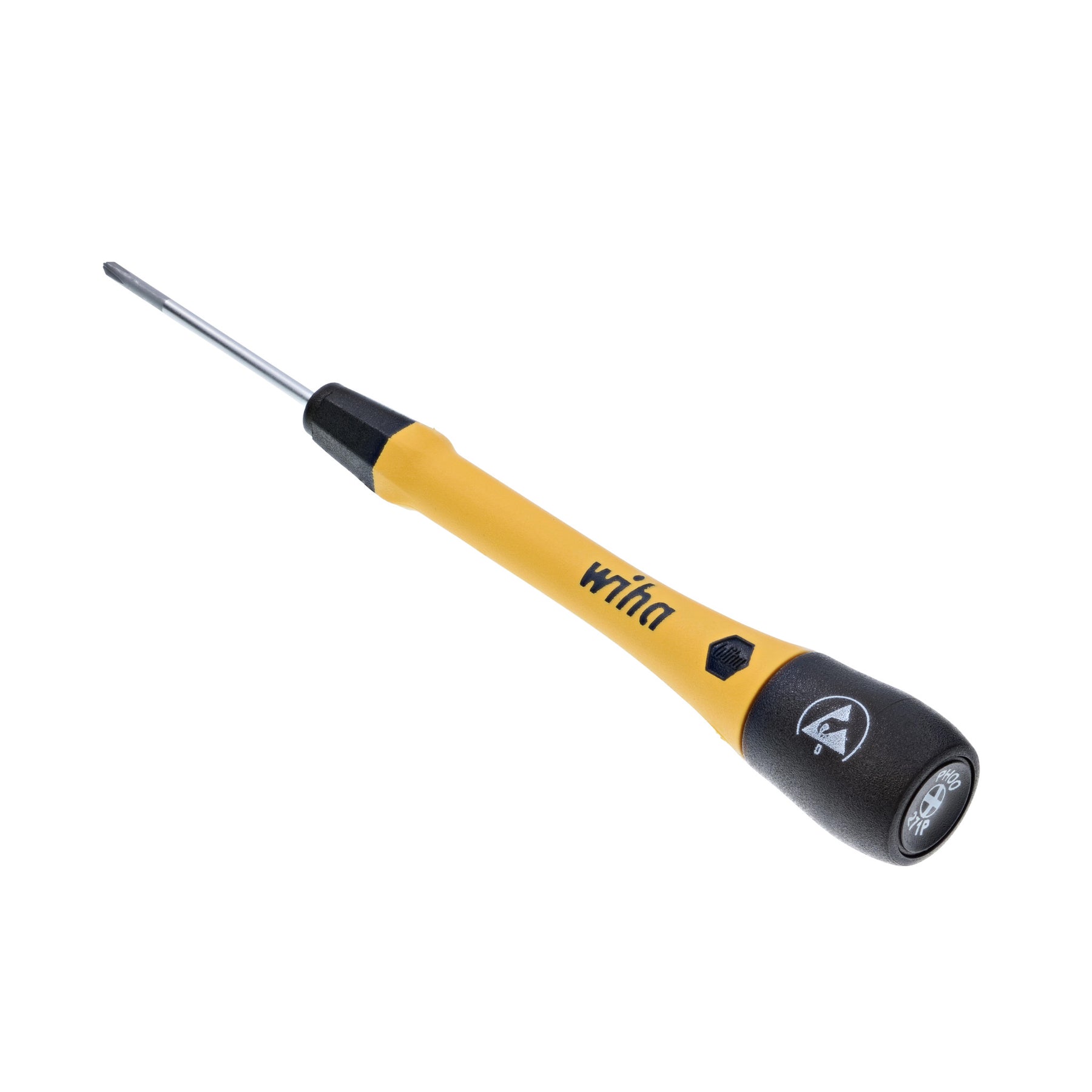 Wiha ESD Safe PicoFinish® Precision Drivers are the standard for premium quality featuring ergonomic cushion grip handles for comfort and control, dual durometer construction for long-lasting durability, and handles directly molded to the blade for a permanent bond. The PicoFinish® style includes a hex profile finger grip for precise torque and control, a tapered handle for rapid rotation, and an extra-long cap for optimal hand positions and smooth turning. The handles are sized proportionately to the blade for consistent mechanical advantage and have driver tip profiles labeled on the cap for easy identification. Wiha ESD Safe PicoFinish® Precision Drivers consist of Wiha premium quality tool steel engineered for strength and durability, have a chrome-plated satin finish for corrosion protection, and feature exact fit precision machined tips for reduced cam-out. Wiha ESD safe precision tools meet ESD Standard IEC 61340-5-1 for protecting electronic devices from electrostatic discharge and have a handle surface resistance of 106 - 109 Ohms for balanced electrostatic dissipation. Wiha premium quality ESD Safe PicoFinish® Precision Drivers are designed and engineered by Wiha Germany and manufactured in Germany. You can invest with confidence knowing that this product is backed by the Wiha No Hassle Guarantee.