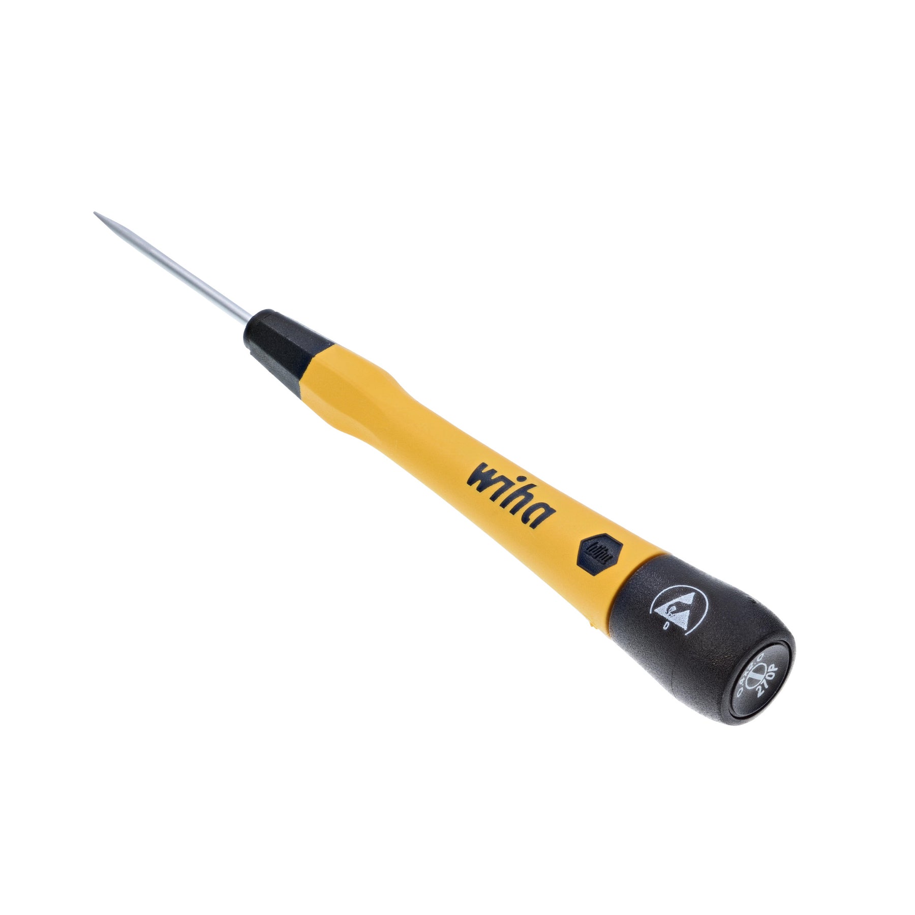 Wiha ESD Safe PicoFinish® Precision Drivers are the standard for premium quality featuring ergonomic cushion grip handles for comfort and control, dual durometer construction for long-lasting durability, and handles directly molded to the blade for a permanent bond. The PicoFinish® style includes a hex profile finger grip for precise torque and control, a tapered handle for rapid rotation, and an extra-long cap for optimal hand positions and smooth turning. The handles are sized proportionately to the blade for consistent mechanical advantage and have driver tip profiles labeled on the cap for easy identification. Wiha ESD Safe PicoFinish® Precision Drivers consist of Wiha premium quality tool steel engineered for strength and durability, have a chrome-plated satin finish for corrosion protection, and feature exact fit precision machined tips for reduced cam-out. Wiha ESD safe precision tools meet ESD Standard IEC 61340-5-1 for protecting electronic devices from electrostatic discharge and have a handle surface resistance of 106 - 109 Ohms for balanced electrostatic dissipation. Wiha premium quality ESD Safe PicoFinish® Precision Drivers are designed and engineered by Wiha Germany and manufactured in Germany. You can invest with confidence knowing that this product is backed by the Wiha No Hassle Guarantee.
