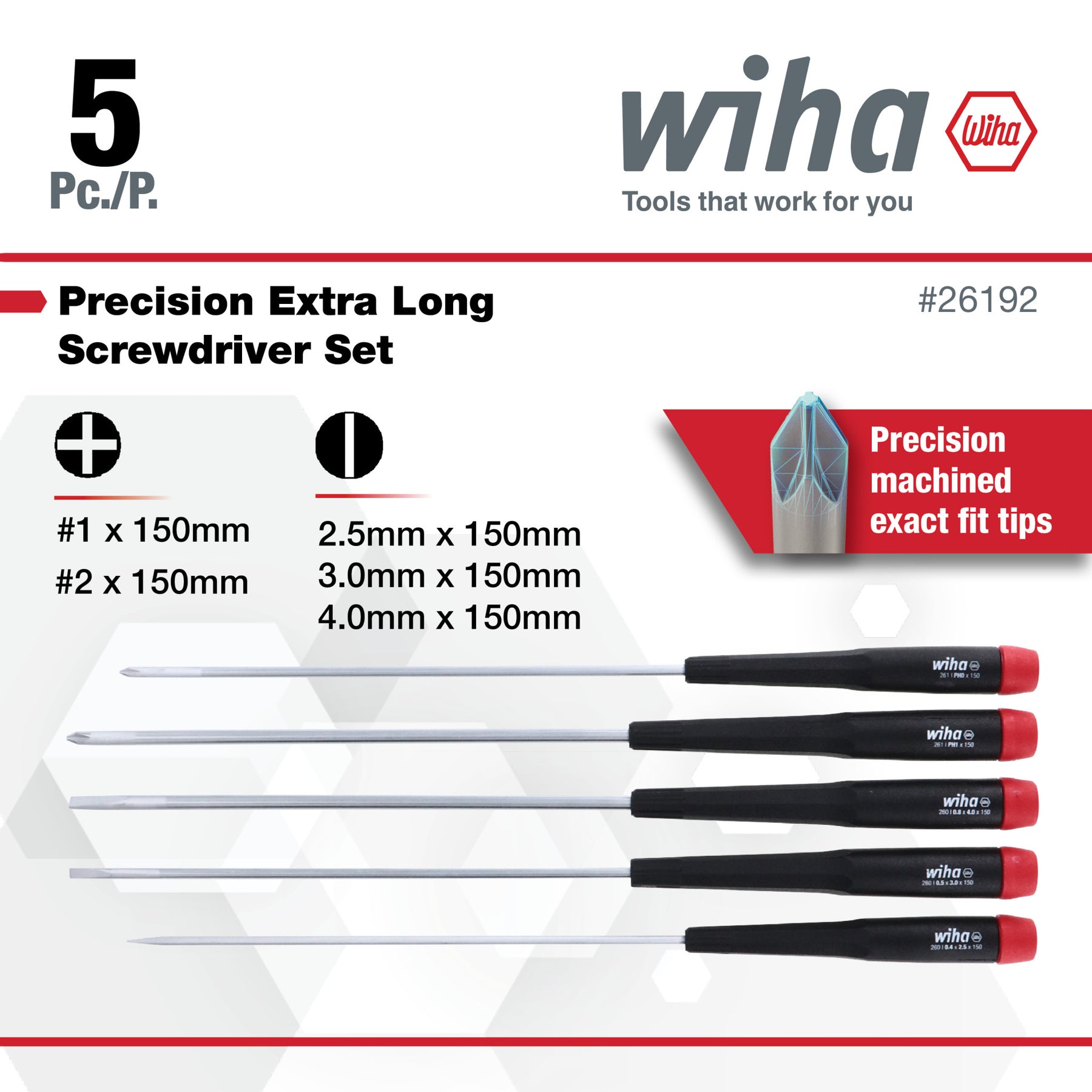 When it comes to working on small components and modern electronics, using the best precision screwdriver is essential—Wiha Precision Screwdrivers are unrivaled. Wiha Precision Screwdrivers feature cushion-grip handles for comfort and control, and the dual durometer material is direct-molded to the blade for a permanent bond. The Precision style includes a hex profile finger grip for precise torque and a tapered handle for rapid rotation. The handles are sized proportionate to the tip and feature an extra-long smooth-turning cap for multiple hand positions. The driver tip profiles are labeled on the handle to quickly and easily identify the driver. Experience the tightest fitting precision-machined driver tips from the company that set the standard for precision. Wiha's exact-fit tips meet the highest tolerances of precision machining to eliminate fastener damage and protect delicate components