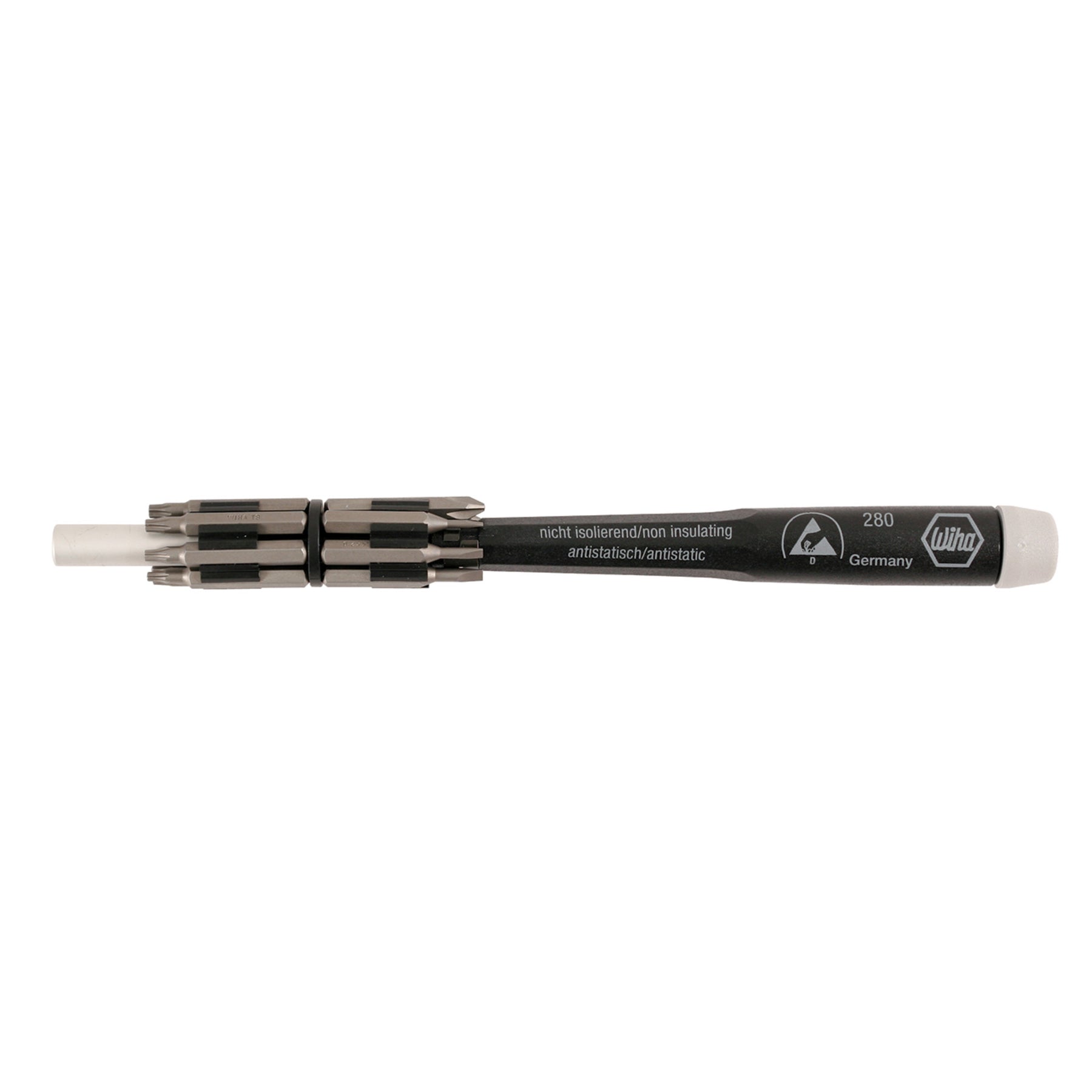 Designed for precision work and electronics applications, the Wiha System 4 ESD Safe MicroBits Set delivers professional-level control and durability. The ergonomic cushion grip handle offers comfort and control, while the handle’s ESD-safe material helps protect sensitive components from electrostatic discharge. Each bit is made from Wiha's CRM-72 high-performance tool steel, through hardened for maximum torque and long wear life. The set includes a 100mm non-magnetic ball retainer bit holder, an indexed bit ring stored within the driver, and deep-forged heavy-duty sockets that will never split. Compact, lightweight, and ideal for demanding environments.