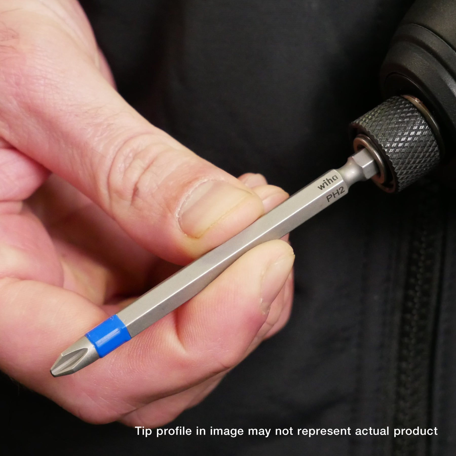 Terminate screws faster—and with fewer broken bits. Wiha's TerminatorBlue Phillips Impact Bits—proven toughest. TerminatorBlue Phillips Bits are impact rated for power tools and rigorously heat-treated to produce a bit lasting 120 times the service life compared to standard bits. Wiha's specially designed torsion zone absorbs the impact energy, allowing a maximum torsion flex that goes unmatched. With TerminatorBlue Impact Bits you get the tightest-fit precision-machined Phillips driver tips from the company that sets the standard for precision. Wiha's exact-fit Phillips tips eliminate excessive bit-wobble for increased driver accuracy. The result is a highly stable engagement with the screw head and a reduction in fastener cam-out that can lead to injury or damage to finished materials.