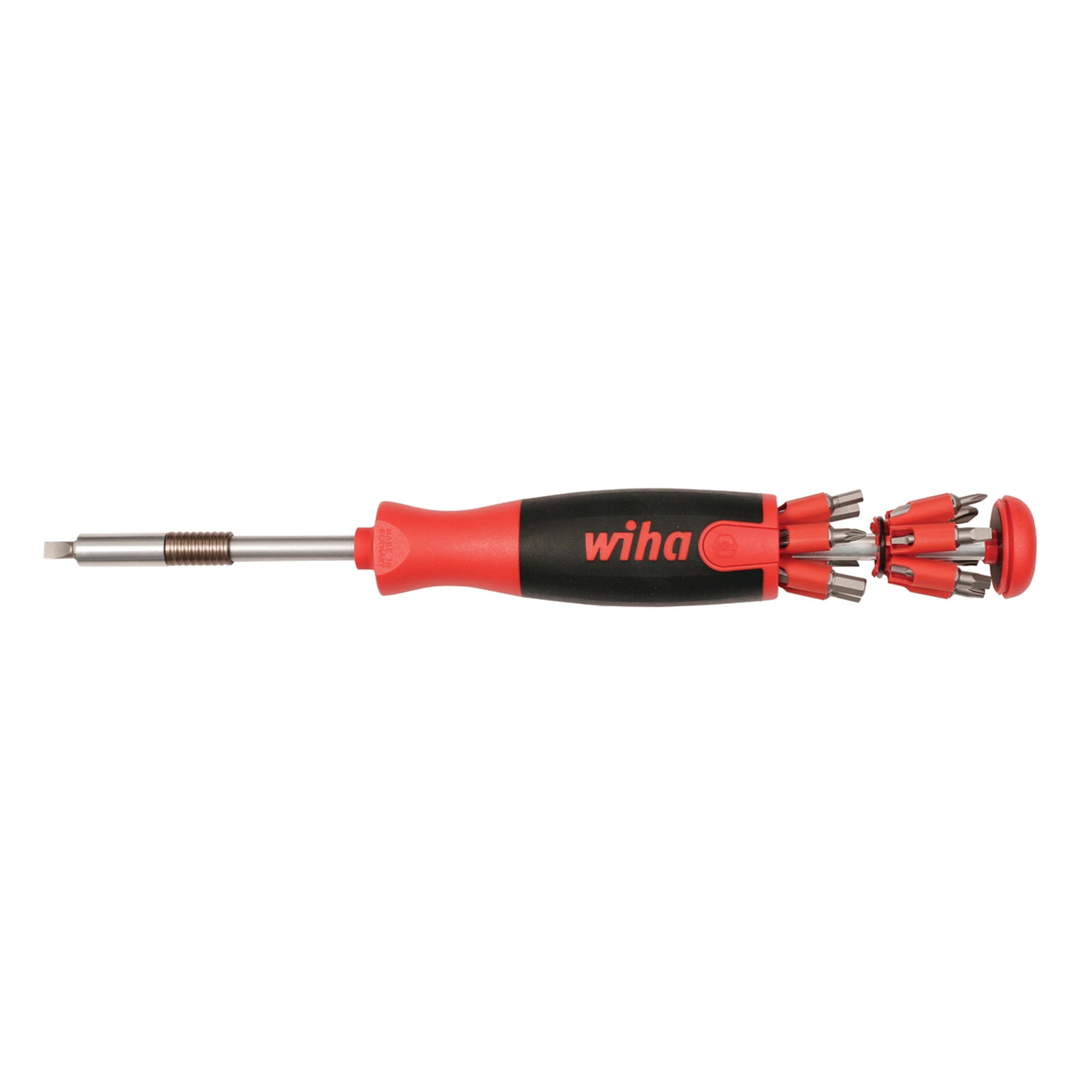 The Wiha screwdriver with the LiftUp 26 bit magazine is only one tool but is equipped with 13 different drives at hand anytime, anywhere. The Ultra Driver replaces an entire screwdriver set. At the press of a button, the bit magazine at the handle end comes out, delivering the 25 mm bits with a 1/4" drive ready for removal. The contained standard bits can be used for both manual and machine operation. The 26 in 1 Ultra Driver has a ergonomic cushion grip handle for comfort and control. For secure and quick bit changing, the Ultra Driver has a locking bit collar and spring riven pop up cartridge. Thanks to its large volume, the ergonomically shaped two-component handle ensures optimum power transmission and maximum torque values. Powerful screw fastening or loosening is therefore particularly easy for the hand. The 26 in 1 Ultra Driver is made with Wiha Tool steel that is specially heat treated to maintain strength, durability and precision.