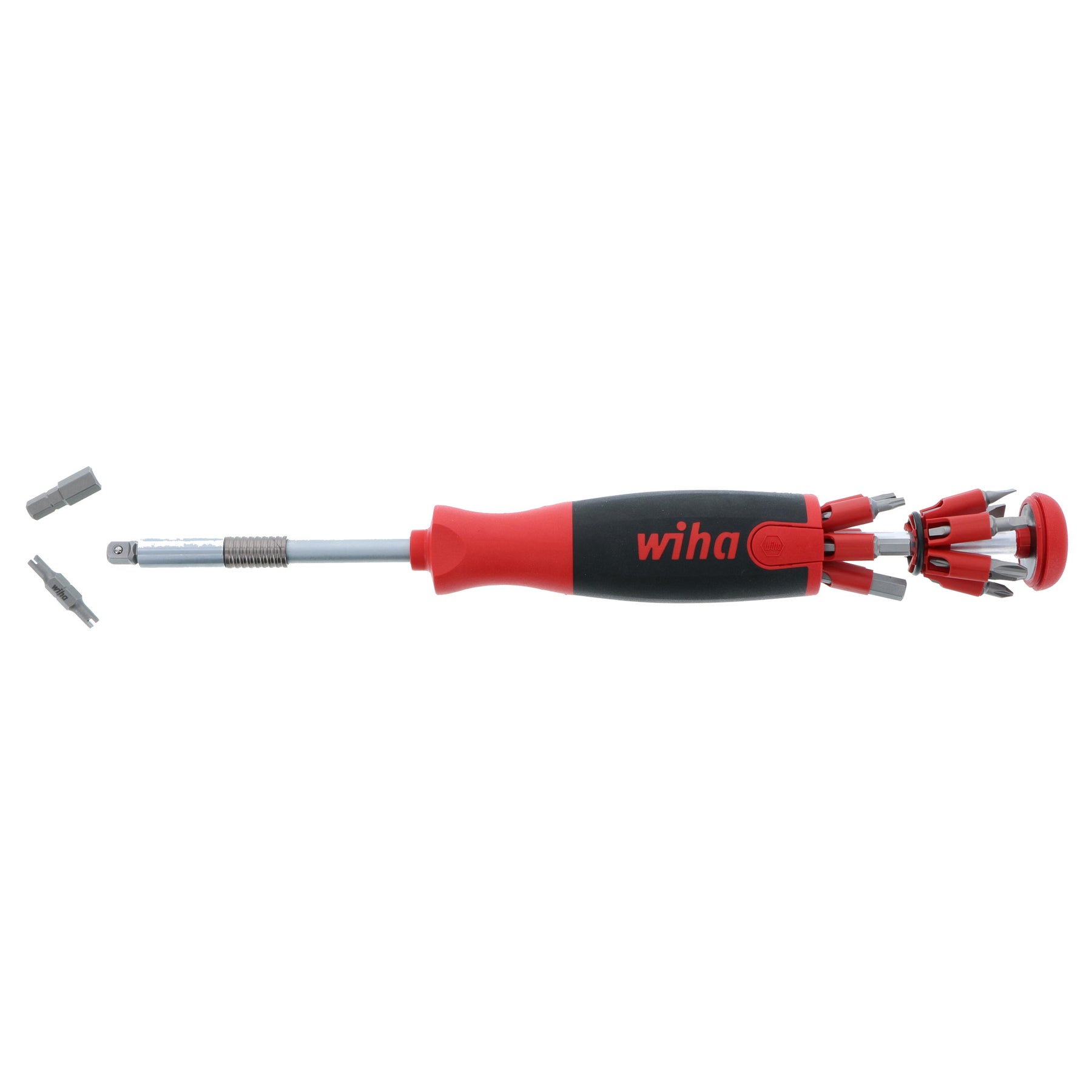 The Wiha screwdriver with the LiftUp 26 bit magazine is only one tool but is equipped with 13 different drives at hand anytime, anywhere. The Ultra Driver replaces an entire screwdriver set. At the press of a button, the bit magazine at the handle end comes out, delivering the 25 mm bits with a 1/4" drive ready for removal. The contained standard bits can be used for both manual and machine operation. The 26 in 1 Ultra Driver has a ergonomic cushion grip handle for comfort and control. For secure and quick bit changing, the Ultra Driver has a locking bit collar and spring riven pop-up cartridge. Thanks to its large volume, the ergonomically shaped two-component handle ensures optimum power transmission and maximum torque values. Powerful screw fastening or loosening is therefore particularly easy for the hand. The 26 in 1 Ultra Driver is made with Wiha Tool steel that is specially heat treated to maintain strength, durability, and precision.