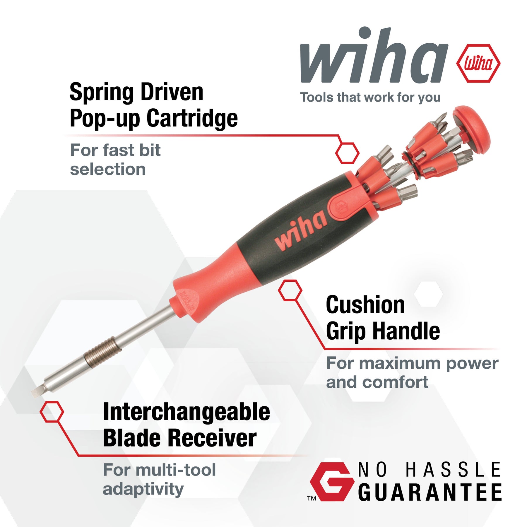 The Wiha screwdriver with the LiftUp 26 bit magazine is only one tool but is equipped with 13 different drives at hand anytime, anywhere. The Ultra Driver replaces an entire screwdriver set. At the press of a button, the bit magazine at the handle end comes out, delivering the 25 mm bits with a 1/4" drive ready for removal. The contained standard bits can be used for both manual and machine operation. The 26 in 1 Ultra Driver has a ergonomic cushion grip handle for comfort and control. For secure and quick bit changing, the Ultra Driver has a locking bit collar and spring riven pop up cartridge. Thanks to its large volume, the ergonomically shaped two-component handle ensures optimum power transmission and maximum torque values. Powerful screw fastening or loosening is therefore particularly easy for the hand. The 26 in 1 Ultra Driver is made with Wiha Tool steel that is specially heat treated to maintain strength, durability and precision.
